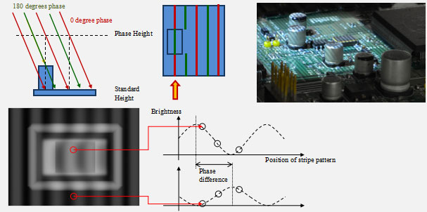 如果使用2組投影,高元件產(chǎn)生的遮擋,會影響到部分區(qū)域的高度檢測.BF-3Di使用4個方向的投影,在有高元件的區(qū)域,可以使用其他角度的投影系統(tǒng)完成高精確度的高度檢測.
